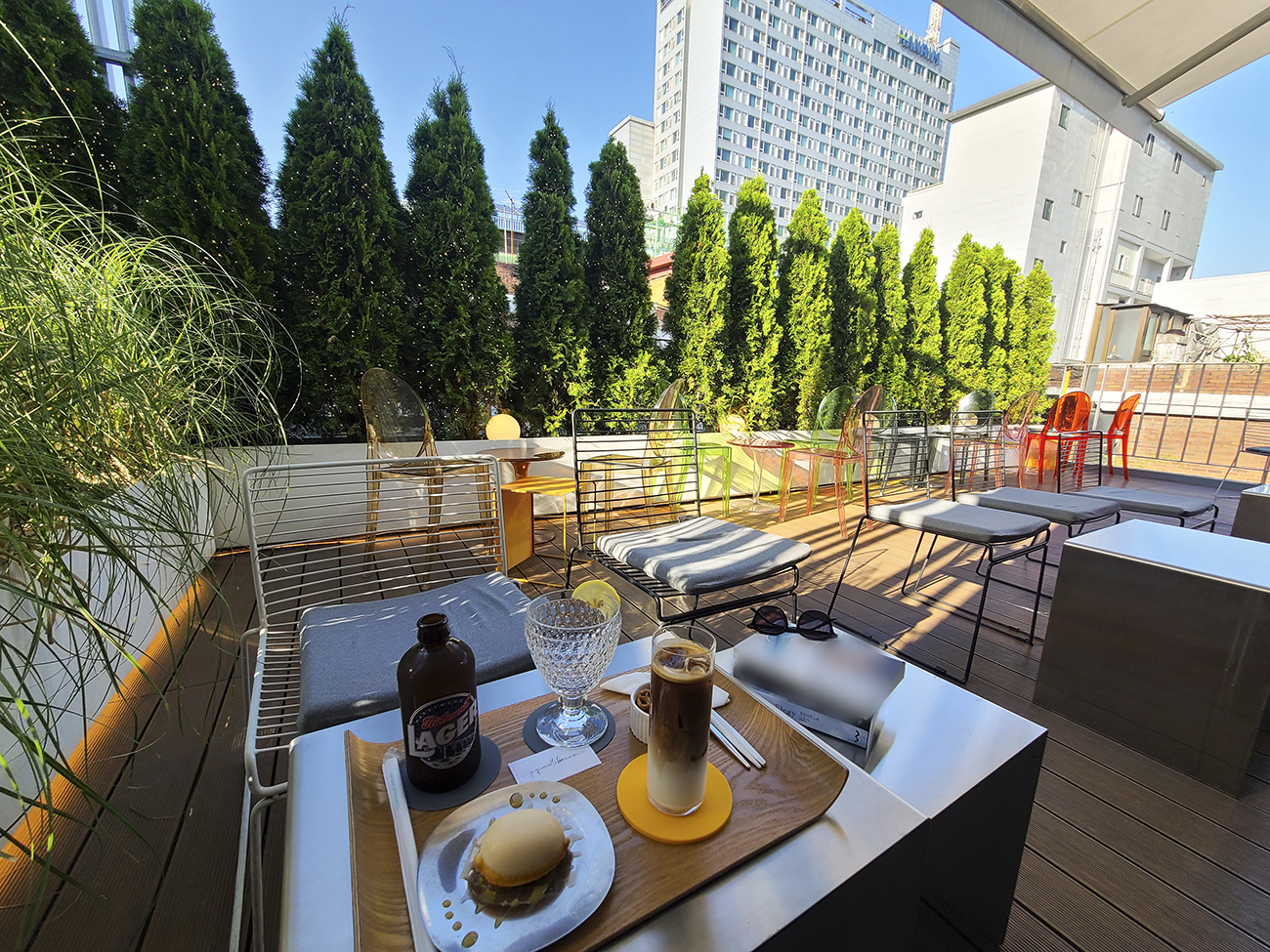 여기 앉았습니다. 주문한 음료와 베이커리는 ‘플랫화이트1)‘ 라는 커피 음료, 리치몬드 라거, 레몬 케이크 입니다. 커피 음료 품질이 매우 좋았습니다. 맥주는 톡 쏘는 맛이어서 제 스타일은 아니었지만 나쁘지 않았어요.