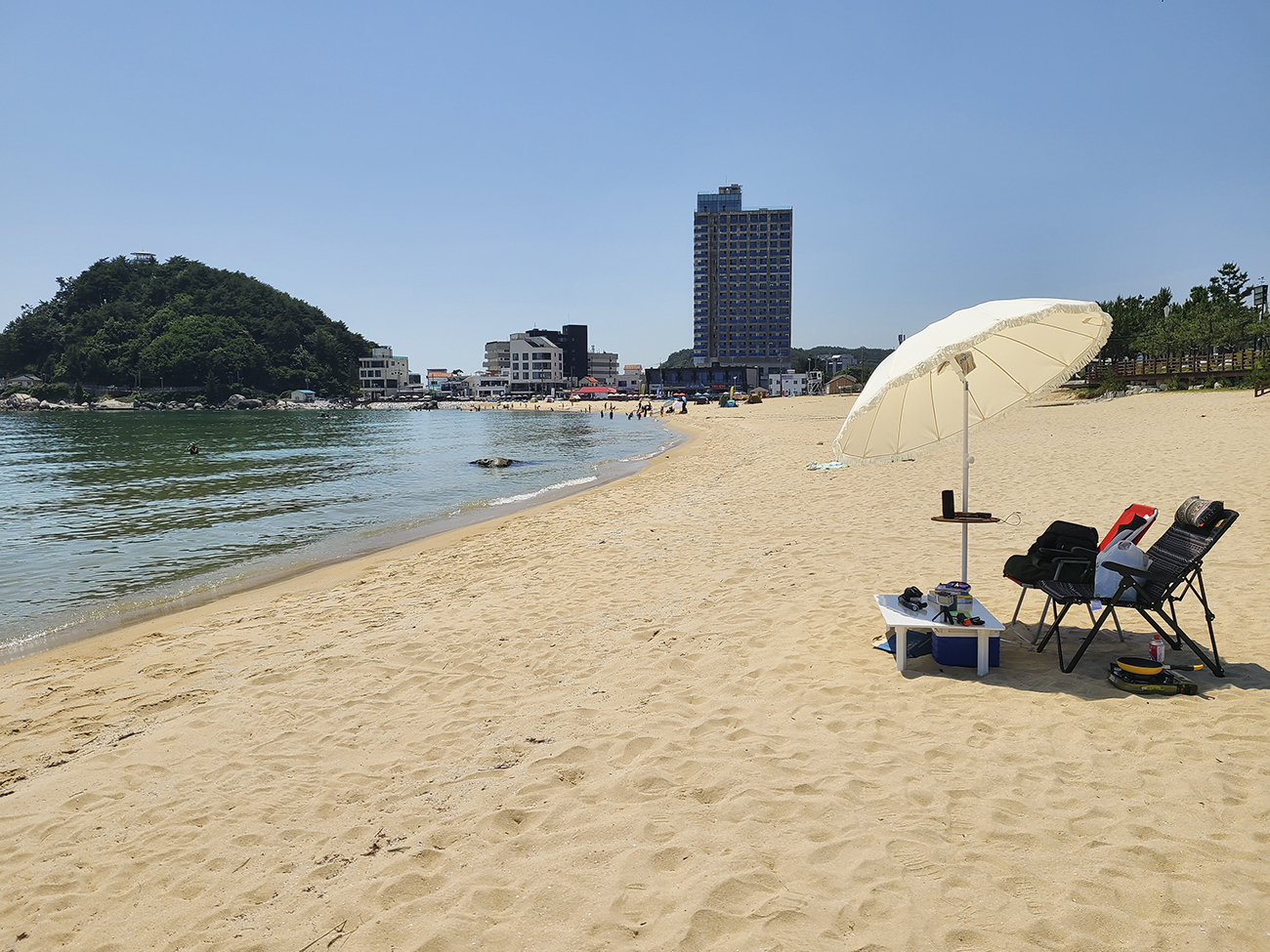 오늘은 파라솔을 폈습니다. 이날은 올해 서핑 여행 중 가장 파도가 없는 날이므로 오늘도 비치에서 휴양 모드입니다. 예전 같으면 실망을 하지만 지금은 전혀 다릅니다. 오히려 더 좋죠. 휴양하며 여유를 즐기는 걸 더 좋아하게 되었기 때문입니다.