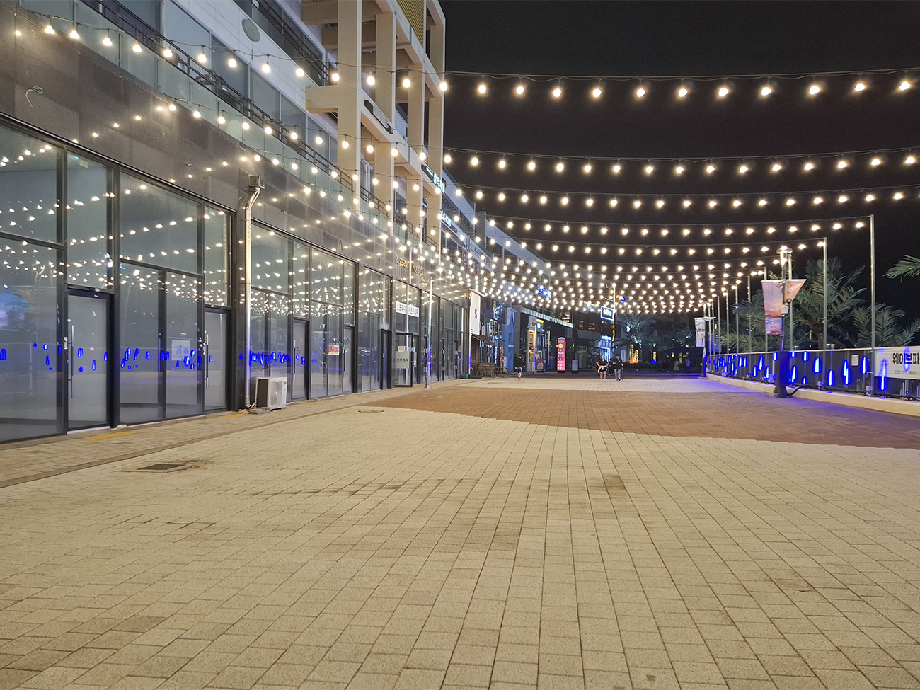 밖으로 나왔습니다. 웨이브파크 주변으로 불빛을 밝히고 있는데 하지만 아직까지는 주변에 편의 시설이 많지 않아요. 아직 공사 중인 건물과 공실이 많은 건물이 많습니다.